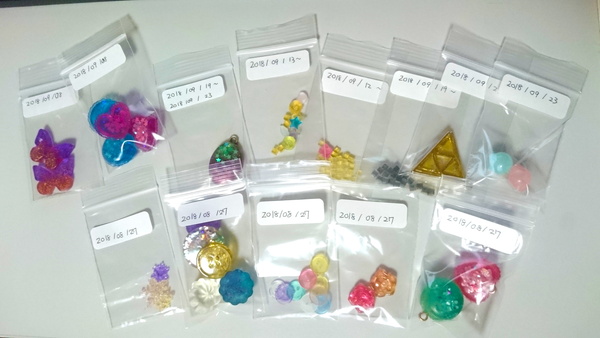 昨日の夜、寝る前に小分け袋に保存しているレジン作品に日付をつけていました。