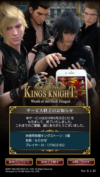 今日でスマホのキングスナイトがサービス終了しました。