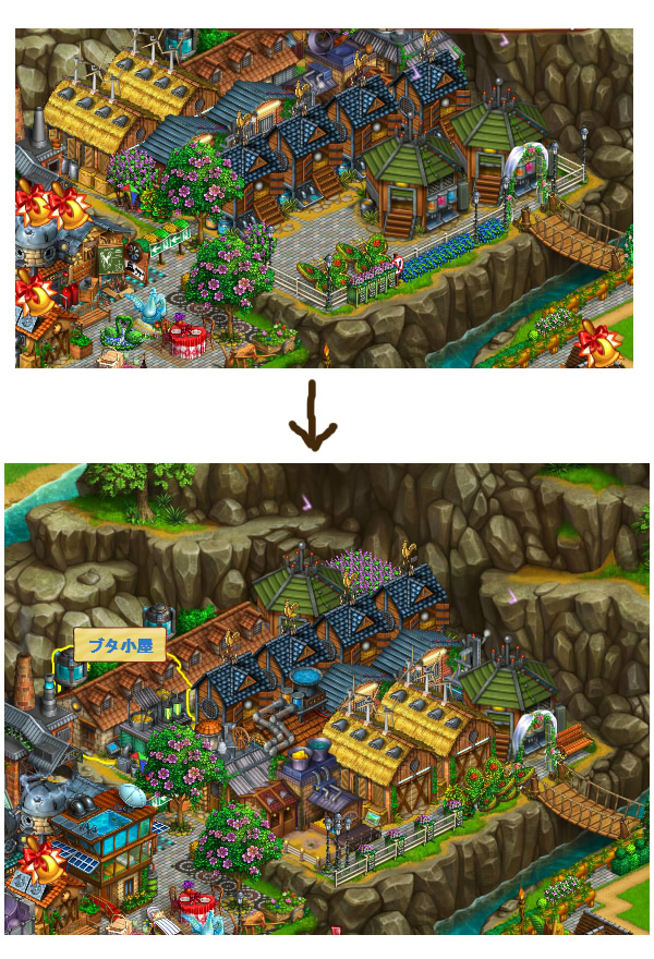 増えたのは黄色い枠の付いてるブタ小屋です。