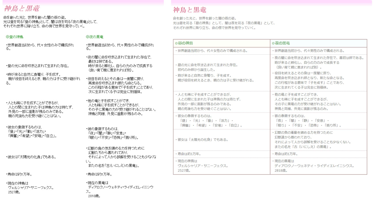 [PR] ×[PR]上記の広告は3ヶ月以上新規記事投稿のないブログに表示されています。新しい記事を書く事で広告が消えます。 ほとんどだらだらしてたけど記事の中身は改装について 今日はお休み。オリジナル部屋の改装をがっつりやるつもりだったけど、まとめ読み漁っちゃって結局作業したの午後の数時間だけでした(ぁキーワードのページを順番に作っていたのですが、神鳥と黒竜のページのテーブルの設定でだいぶ時間がかかりました…。でも見違えるように見栄えはよくなりました。スクールで基礎を学んだおかげで、左から右くらいの進化はしました。どちらもテーブル使ってるのにこの差ですからね…。知識大事。この後もちょっとだけ調整はしましたが、だいたいこんな出来です。別のページにもいくつかテーブルを使う場所があるので、キーワードの項目はもうちょっと時間かかりそう。 PR コメント コメントを書く コメントを書く コメント送信