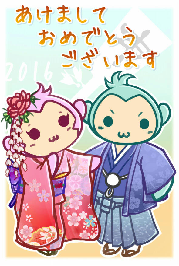 今年は申年ということで振り袖と袴のおさるさんのイラストを描きました。