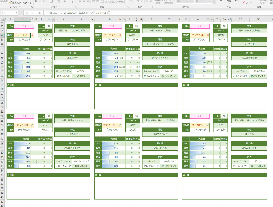 Excelの勉強も兼ねて、育成ポケモンの能力値をまとめた表を作ってみました。