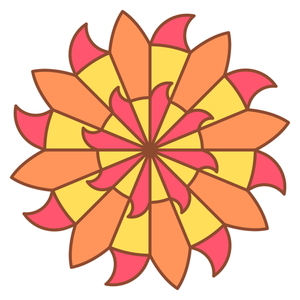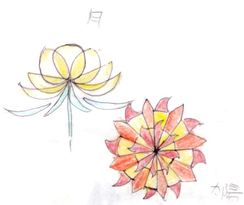 月は満ち欠けを花のようにまとめ、太陽は幾何学模様で作りました。