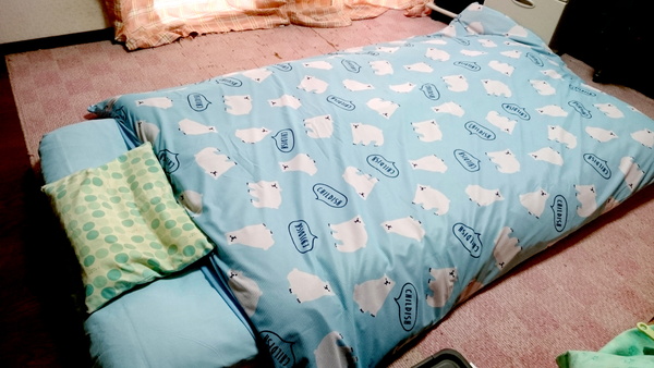 これが新しいお布団です。見た目は青いけど、本体とカバーはベージュと茶色だったりする。