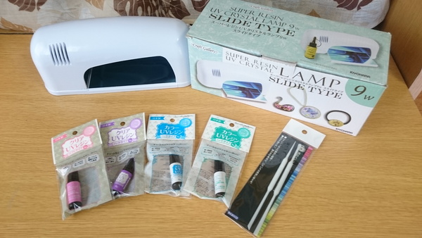 ドリームで買ったのはUVライトと調色スティックで、レジン液はセリアで買ってきました。