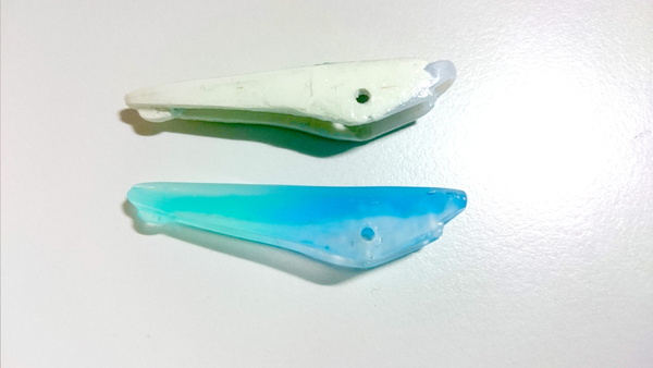 上の折れたクリップから作った原型を参考に、レジンで作ったクリップに穴をあけました。