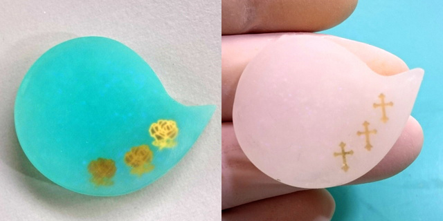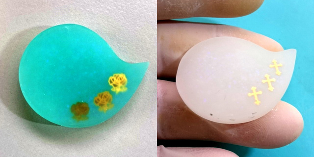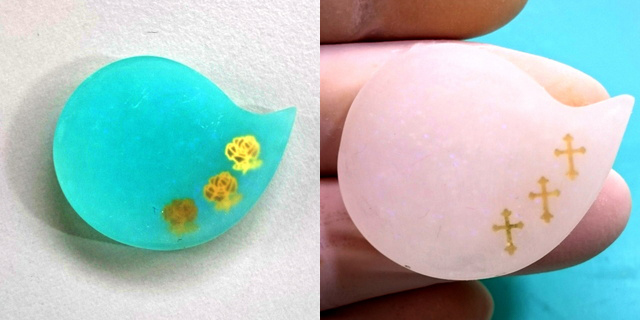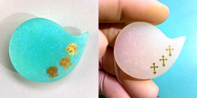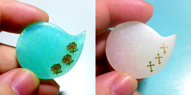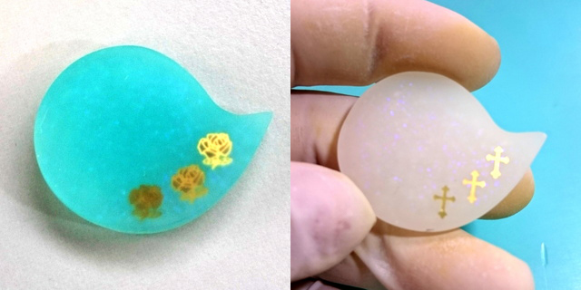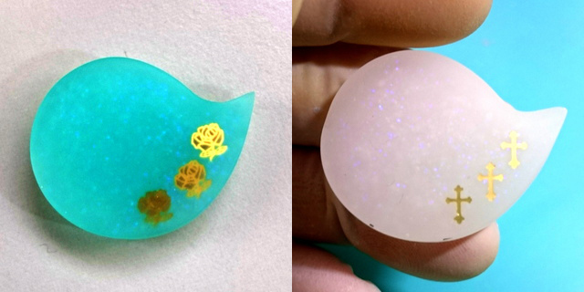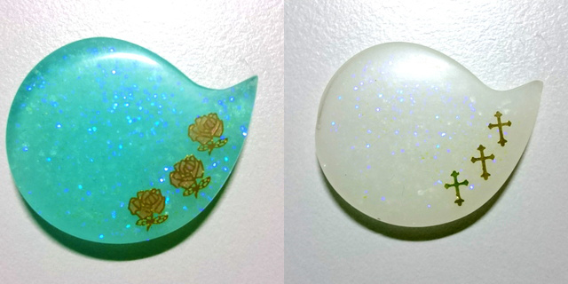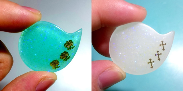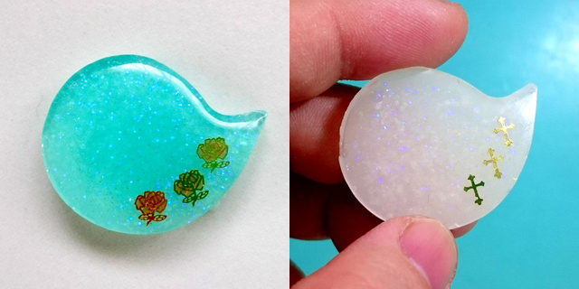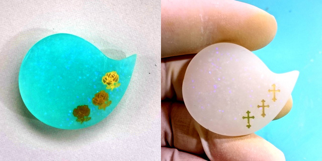 どちらもまずモールドに薄く透明レジンを入れ、封入物を入れています。