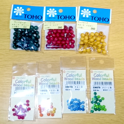 ウッドビーズと速乾レジン液、透明ゴム紐です。