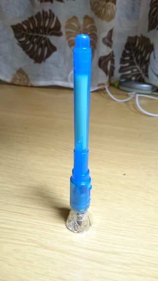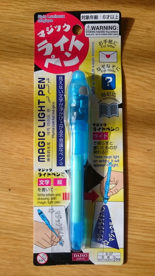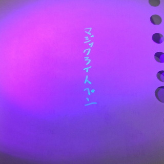 本来は見えないインクのペンで書いたものをライトで照らすと光って見えるというものです。
