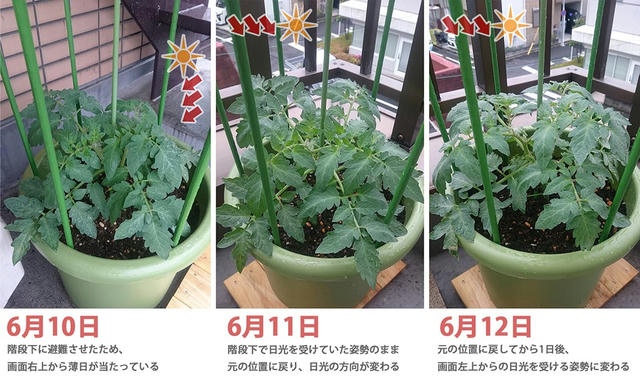 トマトの姿勢の変化の事ですが、朝と夕方の比較もしてみたいですが、