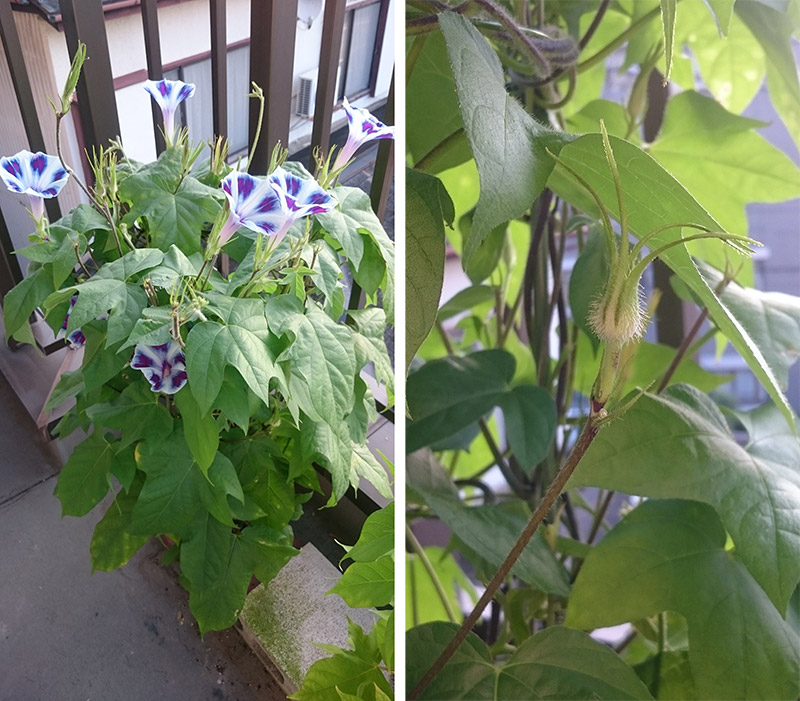 アサガオの花殻を摘んだり、黄色くなった花芽を摘んだり、蔓の誘引をしたりした後、