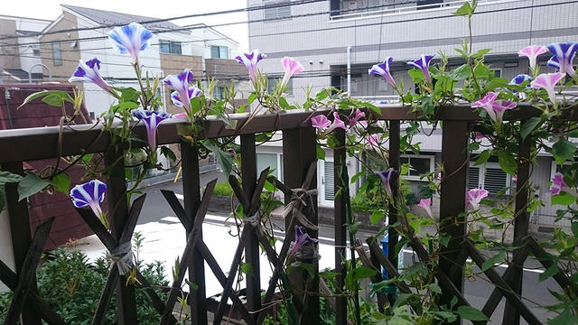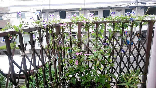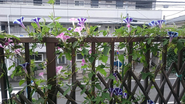 プランター組はみんな、新しい蔓は手すりに巻き付けているので、手すりにばっかり花が咲くようになりました。