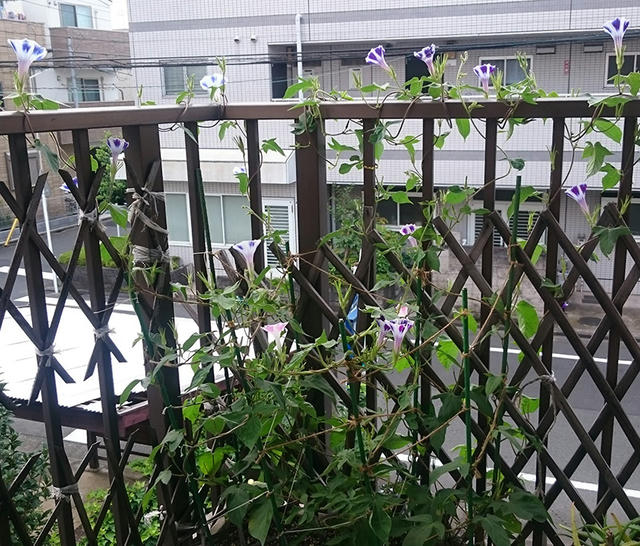 今日のアサガオは、1番が3輪、2番が8輪、3番が4輪、4番が3輪、5番が13輪、6番が3輪、7番が3輪でした。