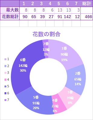 1番がなんと14輪、2番が7輪、3番が2輪、4番が1輪、5番が4輪、6番が7輪、7番が1輪でした。