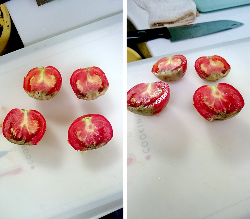 尻腐れの部分を切り取って、赤い無事な部分を一口大に切り、アルミホイルに乗せてグリルで焼きました。