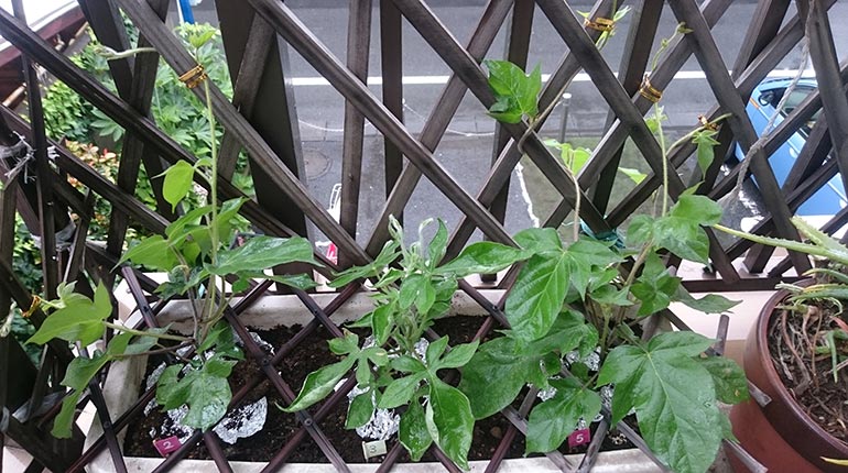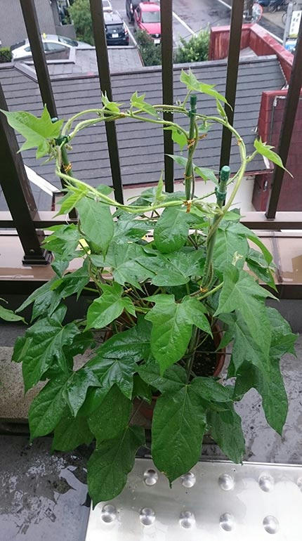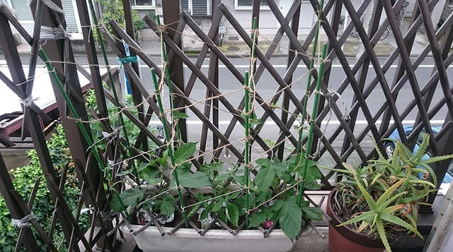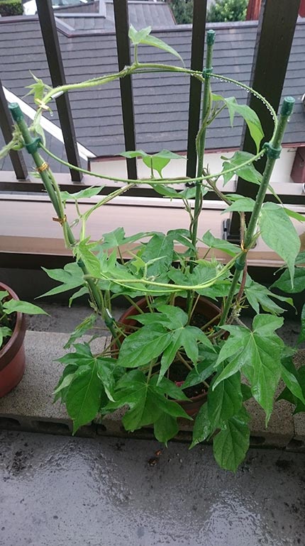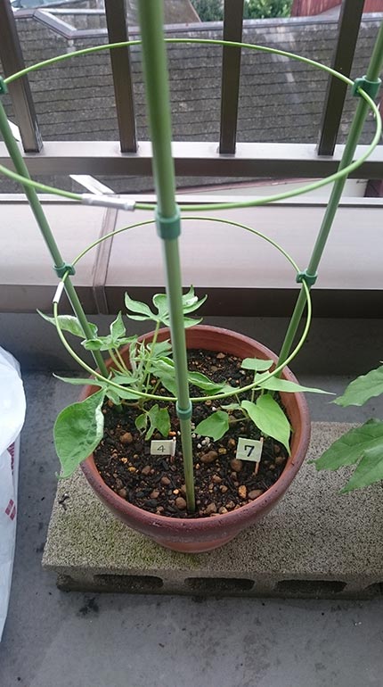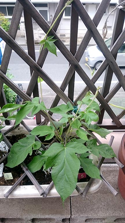 5番はもっと誘引の仕方を考えないと、あっという間に手すりの一番上まで到達してしまいそうですね…。