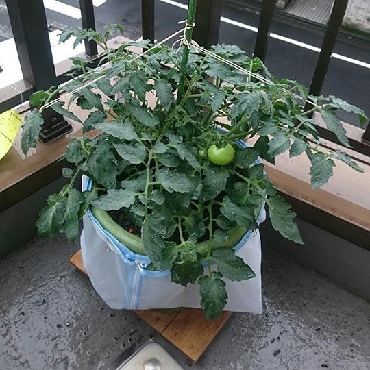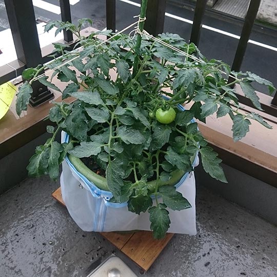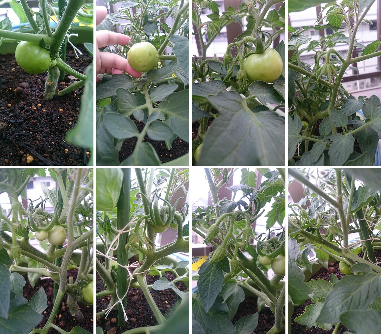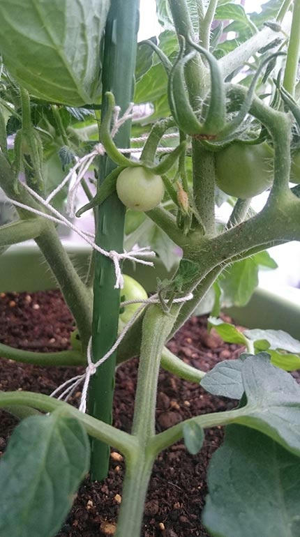 トマトの誘引のし直しや、実の付いた枝の吊り下げ、虫取りシートの設置、