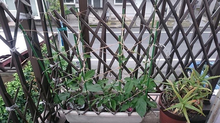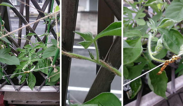 今回のアサガオ、蔓が太くてがっしりしてるので、誘引が難しいんですよね…! -
