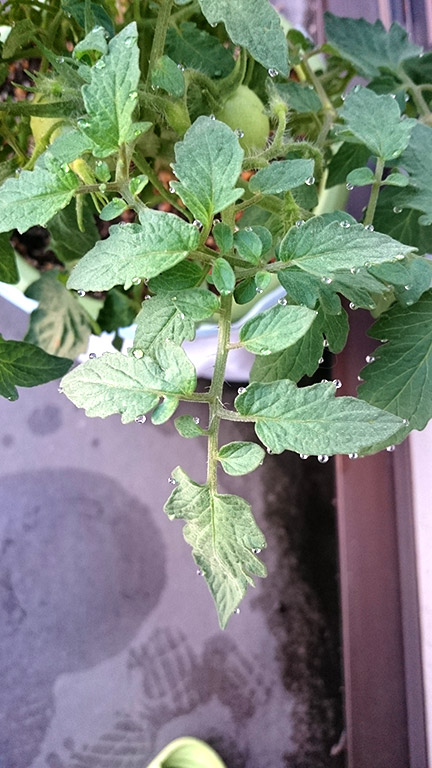 そういえば、朝トマトの様子を見たら、葉っぱの周りにしずくがついていました。